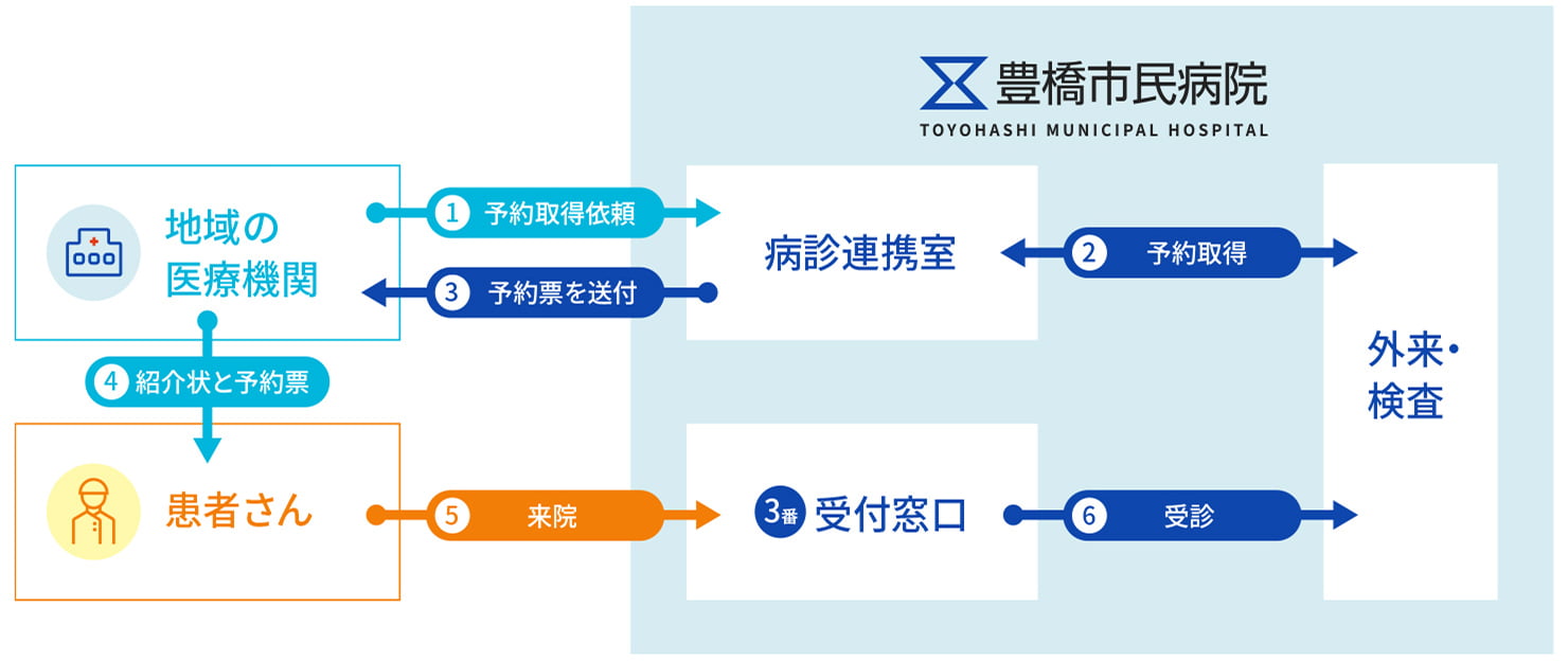 患者さんは、診察・検査日当日「紹介状(診療情報提供書)」「病診連携紹介患者予約票」を❸番紹介状受付に提示してください。