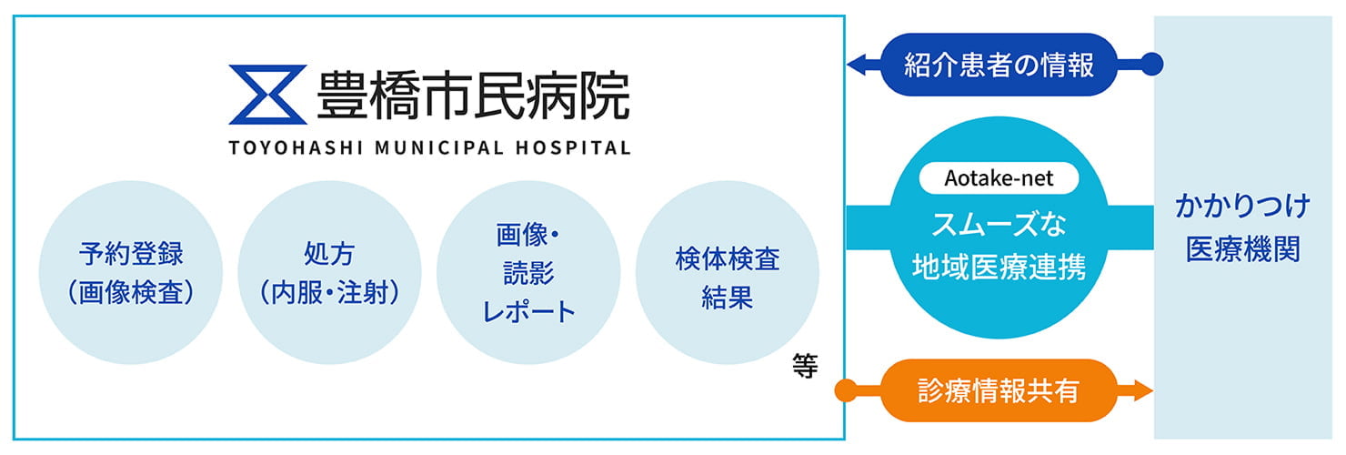 地域の連携医療機関が豊橋市民病院での処方(内服・注射)や検査、治療内容などを閲覧し、診療に反映させることで、切れ目のない安心な医療を提供し、従来にも増した「地域医療の質」向上を目指すものです。また、豊橋市民病院の予約を直接申し込むことができるため、スムーズな診療の連携が行えます。令和7年3月からは、CT・MRIの予約が Aotake-netで予約取得ができるようになりました。今後も Aotake-net を活用して、利便性の向上に努めてまいります。