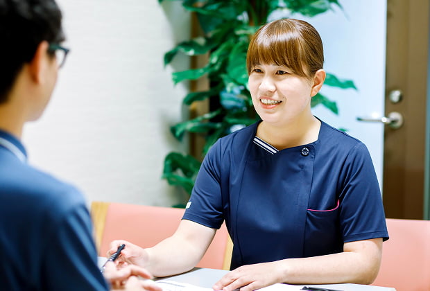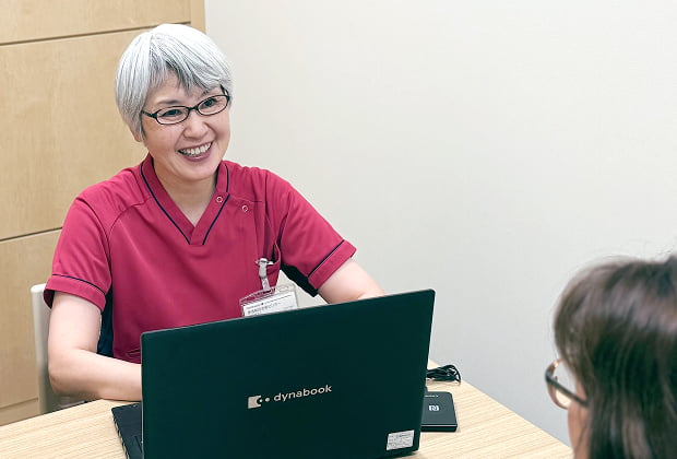 入院が決まった患者さんに入院生活の流れなどをお話しさせていただきます。またお話を聞きながら入院に対する不安や心配事を確認し、医師や病棟看護師などにつなぐ役割を担っています。その中で退院後の生活を見据えて必要があれば、退院支援スタッフと連携していきます。入院説明には約30分程時間をいただいております。