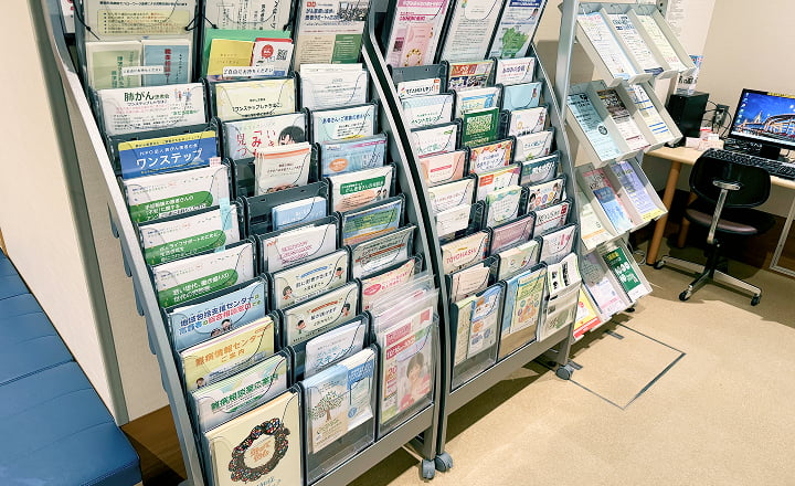 医療や健康に関するリーフレットなどとともに医療情報などを閲覧できるパソコンを設置し、患者さんやご家族等の方に利用していただけるようになっていますので、お気軽にご利用ください。