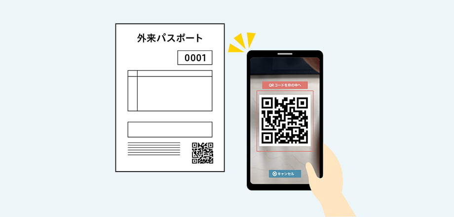 外来パスポートの二次元コードをスマートフォンで読み取ります。