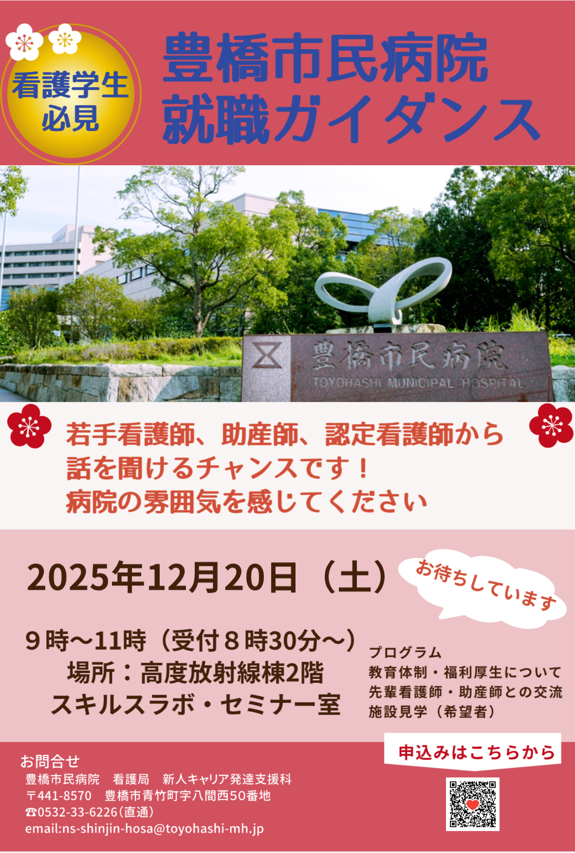 | 募集概要 | 【開催日】 2025年12月20日(土)9時から11時(施設見学希望者は11時30分終了予定) 【会 場】 豊橋市民病院 高度放射線棟2階 スキルスラボ・セミナー室 【対象者】 2027年4月上旬までに免許申請可能な方、または、助産師免許、看護師免許を有する方 【申 込】 2025年11月4日(火)~2025年12月5日(金)17時 【内 容】 看護局について・当院の教育計画・勤務形態・福利厚生・先輩看護師との交流 ・院内見学(希望者のみ) 【参 考】 下部の「豊橋市民病院 就職ガイダンスチラシ」をご覧ください |